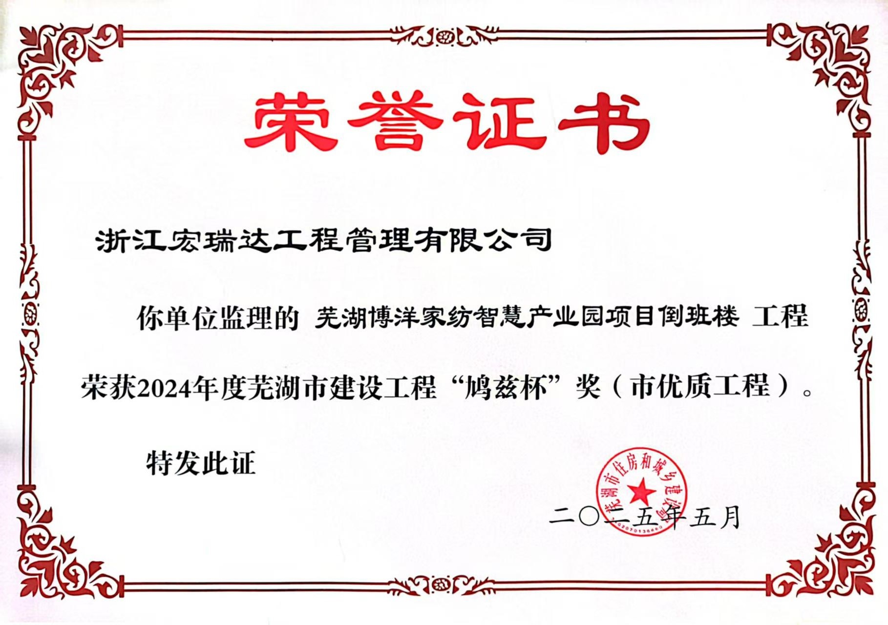 芜湖博洋家纺智慧产业园项目倒班楼工程荣获2024年度芜湖市建设工程“鸠兹杯”奖