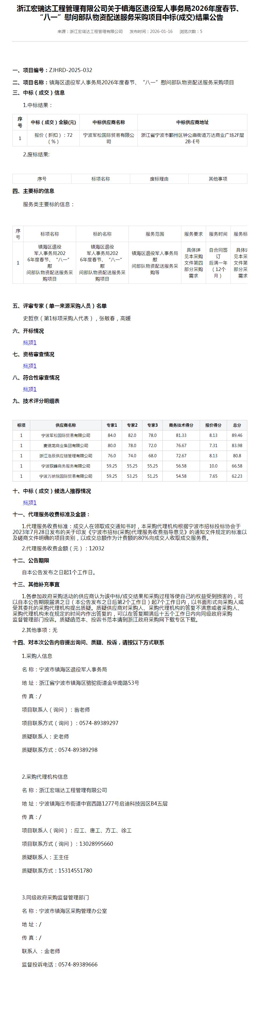 浙江宏瑞达工程管理有限公司关于镇海区退役军人事务局2026年度春节、“八一”慰问部队物资配送服务采购项目中标(成交)结果公告