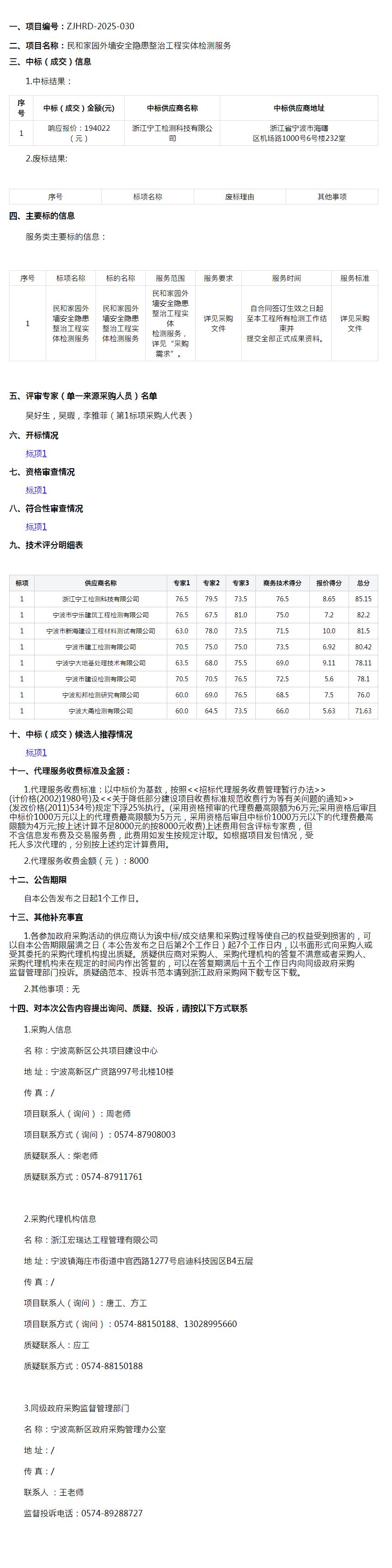 浙江宏瑞达工程管理有限公司关于民和家园外墙安全隐患整治工程实体检测服务中标(成交)结果公告