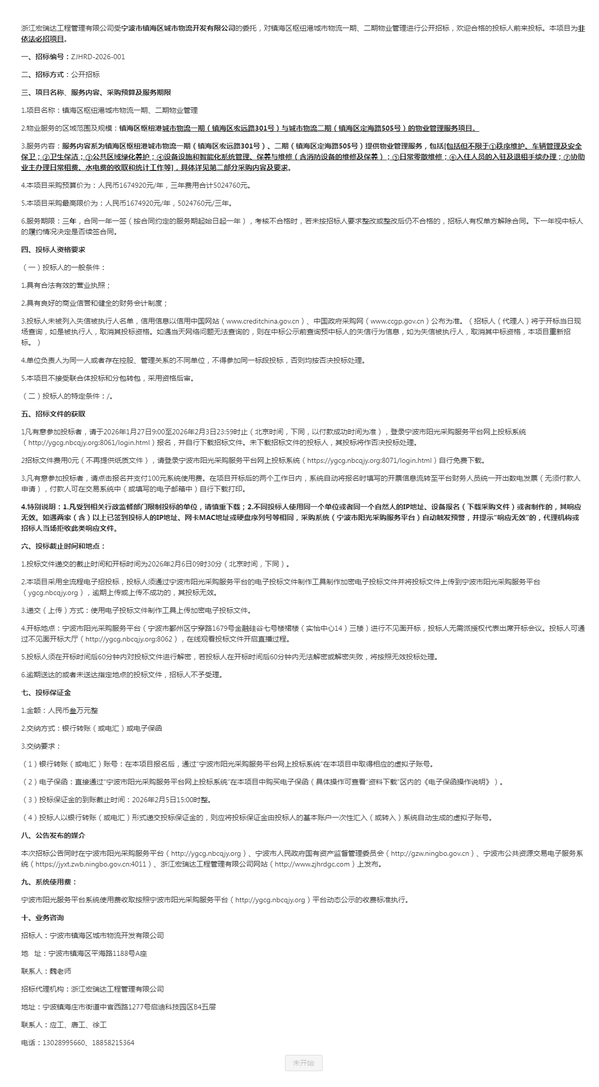 镇海区枢纽港城市物流一期、二期物业管理采购公告